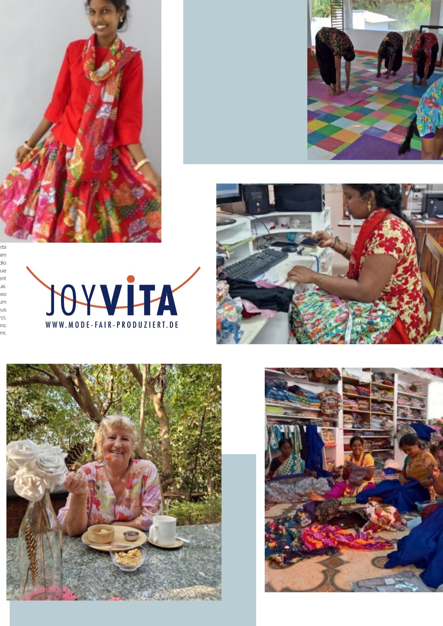 Fotos: Yoga wird für die Mitarbeiterinnen angeboten. Die erwachsene Tochter einer Mitarbeiterin steht als Model für die JOYVITA-Kollektion. Wenn die Näherinnen nicht an der Nähmaschine arbeiten, sitzen sie gerne bei der Handarbeit im Kreis auf dem Boden und tauschen sich aus. Ich sitze derweil beim Frühstück im Garten eines Hotels in der Nähe.